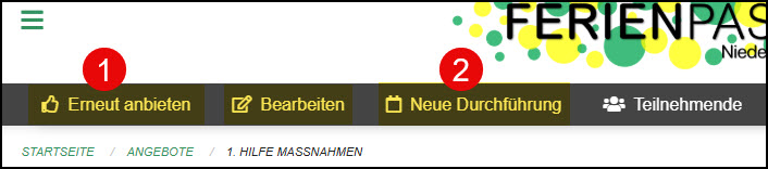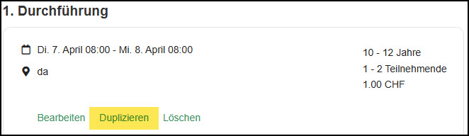 Unter Neue Durchführung (2) sind alle diesjährigen Durchführungen neu zu erfassen. Oder, wenn der Inhalt der letzten Angebote übernommen werden möchte, kann eine bestehenden Durchführung dupliziert werden.